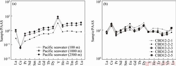 Figure 6 Pacific seawater at different depth (a) (modified from Ref. [14]) and Co-rich crusts in Pacific seafloor (b) (modified from Ref. [15]) PAAS-normalized REEs distribution patterns