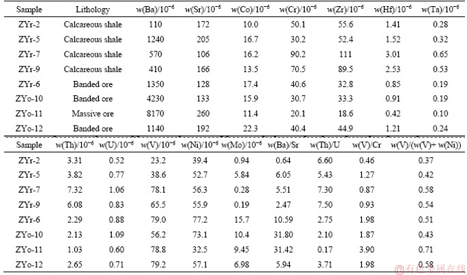 Representative trace element results of eight ore samples are shown in Table 3. The contents of V range from 56×10-6 to 79×10-6, Cr from 20×10-6 to 40×10-6, Co from 11.4×10-6 to 22.3×10-6, Ni from 32.5×10-6 to 77.2×10-6, Sr from 127.5×10-6 to 260×10-6, Mo from 6.98×10-6 to 15.7×10-6, Th from 1.0×10-6 to 2.6×10-6 and U from 0.6×10-6 to 1.0×10-6. The Th/U ratios range from 0.17 to 3.71, V/Cr from 1.87 to 3.90, Ba/Sr from 5.94 to 31.80 and V/(V+Ni) from 0.43 to 0.71.