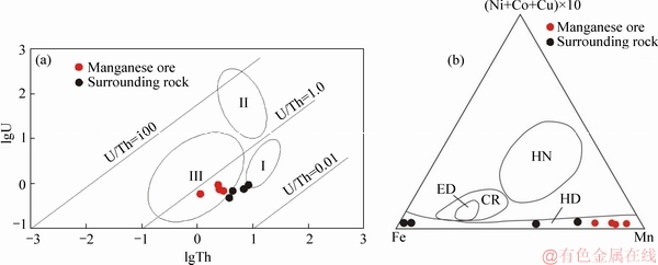 Figure 8 lgU-lgTh diagram (modified from Ref. [19]) (a) and Fe-Mn-(Ni+Cu+Co)×10 diagram (modified from Ref. [35]) (b) of Qujiashan deposit. HD–hydrothermal sediment; HN-hydrolith; CR-Fe-Mn crust; ED-hydrothermal metal deposit of Eastern Pacific; I-Normal ocean sediments; II-Deposited Pacific Rise; III-Palaeo-hydrothermal sedimentation