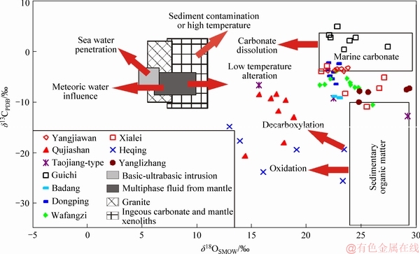 Figure 9 δ13C–δ18O diagram of ores from Qujiashan deposit (The data come from Table 4)