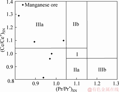 Redox-change may lead to Eu and Ce exhibiting more than one form (Ce3+, Ce4+, Eu3+, Eu2+) [52]. Under high temperature (>250 °C) and highly reductive conditions, Eu occurs as Eu2+, and in the PAAS-normalized REEs patterns it shows negative Eu anomaly [53]. In contrast, under low temperature and relatively oxidizing condition, Eu presents as Eu3+, and in the PAAS-normalized REEs patterns it shows positive Eu anomaly [54-56]. The soluble Ce3+ will be oxidized to insoluble Ce4+ under oxidizing and alkaline condition. And it will adsorb to the surface of Fe and Mn oxides or oxyhydroxides [57-60]. This change leads to negative Ce anomaly in seawater [61] and positive Ce anomaly in ferromanganese sediment(Figure 6). In addition, a formula, (Ce/Ce*)SN= 2CeSN/(LaSN+PrSN), is used to calculate Ce anomaly. And previous studies show that the (Ce/Ce*)SN- (Pr/Pr*)SN diagram can judge whether Ce anomaly affects by La, where (Pr/Pr*)SN calculates from the following equation: (Pr/Pr*)SN=2PrSN/(CeSN+NdSN). Ce anomaly does not affect by La when (Pr/Pr*)SN> 1 or (Pr/Pr*)SN<1, but affection happens when (Pr/Pr*)SN=1 [62, 63]. The (La/Pr)SN values vary from 0.82 to 1.04 (with an average of 0.94) in Qujiashan deposit. In the (Ce/Ce*)SN-(Pr/Pr*) SN diagram (Figure 10), all samples plotted in the field of IIIa, indicating that the Ce anomalies do not affect by La. WRIGHT et al [64] suggested that value of -0.1 for lg(Ce/Ce*) is a redox index. When lg(Ce/Ce*) value is higher than -0.1, it representes reductive environment; and when the value is lower than 0.1 it representes oxidation environment. Furthermore, there is a positive correlation between Al2O3 and δCe, but a negative correlation between MnO and δCe (Figure 7), which suggests that the δCe anomaly is exaggerated by the terrigenous detritus. The range of δEu and lg(Ce/Ce*) values in the ores are from 1.00 to 1.25 (with an average of 1.12) and from -0.02 to 0.11 (with an average of 0.08), respectively, indicating that Qujiashan deposit formed in a weakly reducing to weakly oxidizing hydrothermal environment.