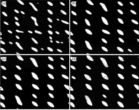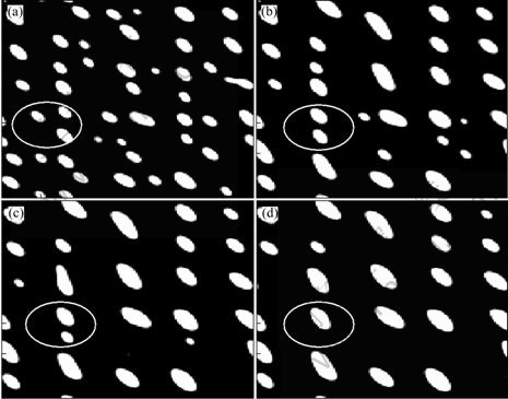 图4所示为错配应力作用下,应变能参数B*=1.687时合金沉淀后期的组织演化图。由图4可以看出,沉淀相椭片状的形貌比错配应力较小时更加明显。从图4(a)中可以看出,某些位置上相距较近的颗粒已经合并,尽管此时沉淀相颗粒仍然较小,但沉淀相长大和粗化在弹性“软”方向上的优先发展已经体现出来。在非弹性“软”方向上虽有部分沉淀相颗粒存在,但其尺寸相对于“软”方向上的颗粒来说比较小。由图4(a)和(b)可以看出,沉淀相颗粒在有利于生长的“软”方向上的粗化过程为非“软”方向上的颗粒消失,部分较近“软”方向上的颗粒合并,最终形成如图4(d)所示的沿[100]和[001]方向上的规则排列。综上所述,在应变能参数为1.687时,沉淀相的粗化过程为非“软”方向上的颗粒消失,部分较近“软”方向上的颗粒合并,其粗化机制主要以位向决定为主。