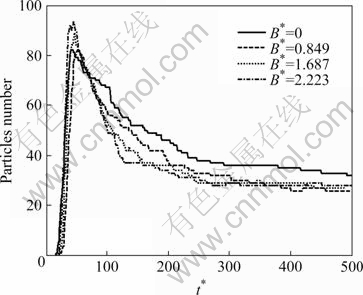 图3所示为错配应力作用下B*=0.849时合金沉淀后期的组织演化图。从图3可以看出,在考虑界面错配应力的条件下,沉淀相颗粒为椭片状,具有一定的方向性;在t*=130时,沉淀相颗粒大小不一,随机分布;随着时间的持续,在t*=460时,粗化基本完成,此时沉淀相颗粒沿着特定的方向排列,该特定方向称为弹性“软”方向,即[100]和[001]方向。铝基合金弹性各向异性因子为负值[12],界面错配应力在<100>方向上达到最小值,所以粗化完成后,沉淀相颗粒沿[100]和[001]方向规则排列。同时由图3可以发现,考虑错配应力时,合金的粗化过程并不是错配应力为零时单纯的大颗粒长大及小颗粒溶解的过程。在t*=130时,图3(a)中标示的3个颗粒中最下面的颗粒最大,上排两个颗粒大小基本相当;在t*=260(见图3(b))时,上排原来大小基本相等的两个颗粒中,左边的颗粒已经消失,右边的颗粒逐渐长大,尺寸已经大于正下方起初最大的颗粒;随着时间的延续,上面的颗粒继续长大,下面的颗粒逐渐减小,t*=460(见图3(d))时完全消失,最终只有上面的颗粒单独存在。由图3(a)中3个颗粒的位置可以发现,上排右方的颗粒是处于弹性“软”方向上的,而其他两个颗粒则处于弹性“软”方向以外,所以在这组颗粒的粗化过程中,弹性“软”方向这一位置因素起了主要作用。这种现象与 Ostwald 熟化规律正好相反,称这种现象为应变诱发反向粗化[13]。20世纪60年代,Khachaturyan 和Statalov基于能量最小原理预测过在一定条件下会出现这种反向粗化现象[14]。JOHNSON等[15]采用动力学方程在仅考虑两个粒子的条件下模拟得到过这种结论。由此可以看出,由合金沉淀过程产生的晶格错配引起的界面错配应力,对沉淀组织的形貌及颗粒的粗化行为有着显著的影响。错配应力作用下的粗化行为较为复杂,主要是因为弹性各向异性导致沉淀相并非球状,以及长程弹性交互作用使沉淀相产生强烈的空间关联,从而沿一定的晶体学方向排列。