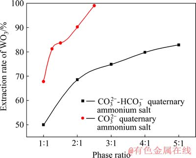 考察不同相比条件下HCO3--CO32-混合型季铵盐的萃钨效果,并与CO32-型季铵盐的萃取效果进行对比,实验结果如图1所示。实验中料液WO3浓度为115 g/L,Na2CO3浓度为100 g/L,pH值为10.6,萃取温度为25 ℃,萃取时间为5 min。