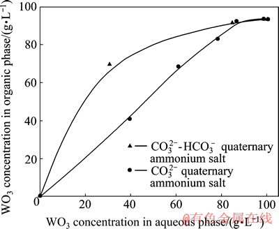 采用饱和法分别绘制萃取剂为HCO3--CO32-混合型季铵盐和CO32-型季铵盐的萃取等温线,料液中WO3浓度为100.36 g/L,Na2CO3浓度为101.12 g/L,萃取温度为25 ℃,萃取相比O/A为1:1,萃取时间为5 min,其结果如图5所示。