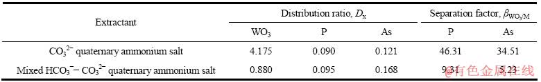 由表2可看出,HCO3--CO32-混合型季铵盐与CO32-型季铵盐类似,在萃取过程中P和As的分配比显著小于WO3的分配比,但前者的分离系数