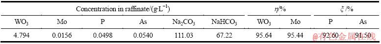 表3和4显示,串级萃取获得的萃余液为含有少量杂质的Na2CO3-NaHCO3混合溶液。将该萃余液加石灰处理可使其中的NaHCO3转化为Na2CO3,处理后的溶液则转化为含少量钨和杂质的Na2CO3溶液,该溶液可直接返回钨矿的苏打高压浸出工序,实现萃取过程水和碱的回用。