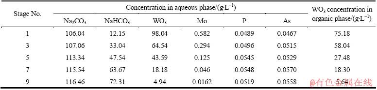 由表4可见,由第9级(水相出口级)至第1级(水相进口级),槽体中有机相和水相中WO3浓度逐级升高;水相中NaHCO3和Na2CO3浓度逐级下降,符合逆流萃取过程的一般规律。而水相中P和As的浓度则呈现先升高而后降低的趋势,这是钨与P和As在各级竞争分配的结果。表4还显示,钼与钨在串级萃取过程中的行为相似,进一步说明该过程不能实现钨、钼的分离。