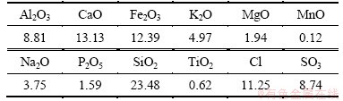 本实验飞灰呈暗灰色粉末状,烘干后颜色变淡,含水率为0.97%~2.54%。采用X线荧光光谱仪(XRF)和归一化法对飞灰主要化学成分进行测定,结果见表1。从表1可以看出:飞灰主要由Si,Ca,Fe,Al,Cl,S,K和Na等元素构成,约占总质量的87%。飞灰中含有较多的Ca,可能由于在控制焚烧产生的酸性气体时,喷入了一定量的石灰。飞灰中Cl质量分数较高,这与污泥及垃圾的成分有关,Cl质量分数较高易导致飞灰中重金属的浸出及高温过程中的挥发。