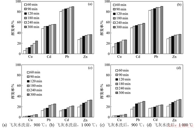 由图3(a)和图3(b)可以看出:飞灰中Cu和Zn的挥发特性与Pb和Cd有所区别,但区别不是很大。在900 ℃条件下,Cu的挥发率总体很低,但在60~300 min,其挥发率增加要比其他3种金属快,而Zn挥发率在前120 min内增加较快,在120~300 min挥发较慢,曲线较平坦;在1 000 ℃条件下,Cu在前90 min挥发较快,而Zn在整个时间范围内挥发率变化较小,总体来讲Cu比其他3种重金属难挥发。Cu的挥发率较Pb和Cd的低,与其存在形式有关。飞灰中Cu可能不是以CuCl2为主要形式,可能以CuO或CuS存在,因为CuCl2沸点为993 ℃[24]。由图2可知:当温度在900~1 000 ℃时,Cu挥发率增加比较缓慢,可以认为Cu主要以氯化物以外其他形式存在。