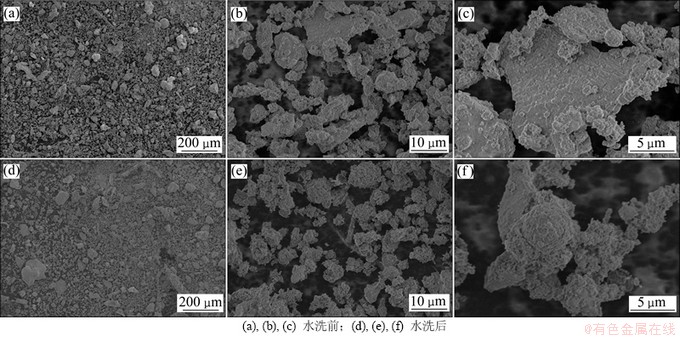 图4所示为水洗前后飞灰的SEM图。观察图4可以发现:水洗后的飞灰与未洗的飞灰微观形貌不同,水洗后飞灰中的小颗粒减少,絮状体减少,颗粒表面光滑,颗粒的轮廓清晰,一些易溶解的物质可能被清除。这也说明了水洗过程去掉了大量的水溶性氯化物(如NaCl,CaCl2和KCl等),导致其他物质被浓缩而含量增高。张玲等[14]研究表明水洗过程对飞灰中Cl,Na,K和Ca元素具有一定的去除效果,尤其是Cl元素的去除率在液固比为10 L/kg时可达到60%,KC1和NaC1是水洗过程中K,Na和Cl元素的主要去除形态,本次研究与此结论比较吻合。