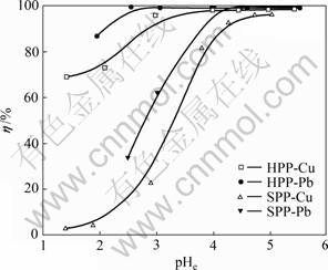 1) SPP和HPP对Cu2+和Pb2+的吸附受溶液pH值的影响较大。当pH增至4.0~5.0之间,吸附率均可达到98.0%以上。
