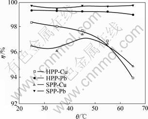 图2 温度对SPP、HPP吸附Cu2+和Pb2+性能的影响
