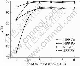 Fig. 3 Effect of solid to liquid ratio on adsorption of Cu2+ and Pb2+ by SPP and HPP