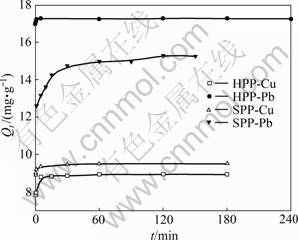 图4 吸附时间对SPP、HPP吸附Cu2+和Pb2+性能的影响