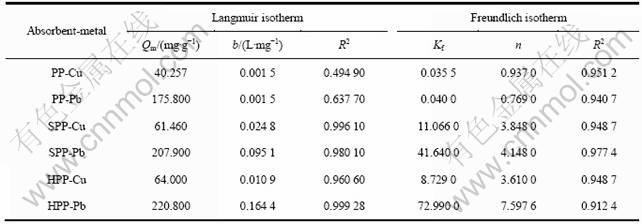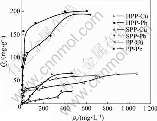 4) SPP和HPP对Cu2+和Pb2+的最大吸附容量均较PP的有所提高。