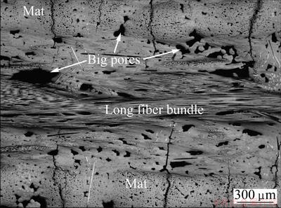 Figure 1 shows the optical image of the composite. It can be found that there are numerous residual pores in mat and some prolate pores in long fiber bundles. At the interface between the long fiber layer and short fiber mat the size of some residual pores can reach several hundreds of microns (big pores in Fig. 1). Generally speaking, pyrocarbon firstly deposits on the fiber surface and grows up gradually surrounding carbon fiber, and the pore filling depends on the gas infiltrating into the deposition zone in the process of chemical vapor infiltration. When a certain zone is filled completely with pyrocarbon, the gas will be very difficult to go on diffusing through it, which results in the formation of the residual pore in the composites. With the progressive densification, the difficulty of the pore filling is increasing. It can be concluded from the filling and distribution of the residual pore that, the pyrocarbon firstly deposits on the fiber surface and grows up gradually, and surrounds the fiber as the micro deposition space decreases. Moreover, compared to the other positions, the gas infiltration at the interface between long fiber bundle and mat is more difficult, so that the big residual pore is easily to be formed at these positions.
