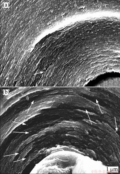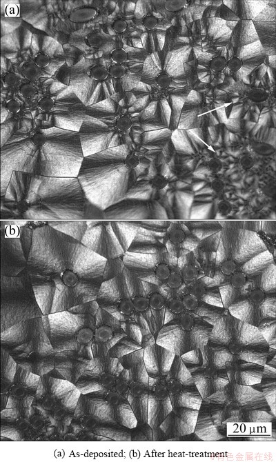 Figure 2 shows the PLM microstructures of the composite. The carbon fiber is surrounded by pyrocarbon matrix, and the matrix exhibits numerous irregular pyrocarbon growth-cones (white arrows) and clear extinction crosses, indicating that it is typical SL texture [17]. After heat-treatment, the optical activity of pyrocarbon slightly increases, and some tiny growth- cones in the deposited sample have not been found in the heat-treated sample (Fig. 2(b)).