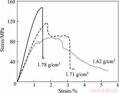 Figure 3 demonstrates the stress—strain curves of the samples with different density at the deposited state. It can be found that, the samples with the density of 1.78 g/cm3 display the typical brittle fracture mode, the samples with a density of 1.71 g/cm3 exhibit a “ladder” type fracture, and the samples with low density of 1.62 g/cm3 present pesudo-plastic fracture characteristic. It is obvious that the toughness of the sample becomes better with the decrease of density, while the flexural strength decreases together with the modulus (Fig. 4).
