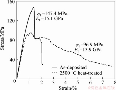 Figure 6 shows the stress—strain curves of the composites with SL pyrocarbon matrix before and after heat-treatment. It can be found that, at the initial loading stage, the stress of the sample shows a linear relationship as a function of the strain. For the as-deposited sample, the stress reaches the maximum value after a little yielding and then presents the abrupt drop showing the “ladder” type fracture characteristic. For the heat-treated sample, the stress undergoes some “zigzag” waves before reaching the maximum value and the stress—strain curve becomes more placid, presenting an ideal pseudo-plastic fracture characteristic. Compared to the deposited sample, the flexural strength of the heat-treated sample decreases by 35%, and the plastic fracture characteristic becomes more distinct. The flexural modulus exhibits a less decrease compared with the stress. It can be concluded that the high temperature treatment can greatly improve the fracture toughness of the composite.