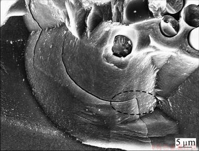 After heat-treatment, the apparent layer stack height Lc increases, the interlayer spacing d002 value decreases, the graphitization degree of pyrocarbon increases (Fig. 10), and the residual stress generated during chemical vapor infiltration can be released [20]. From Fig. 8(b), it can be found that the inter-laminar micro-crack in SL pyrocarbon matrix after heat treatment is more (white arrows) compared to the deposited state, involving numerous tiny wrinkled layered structures. It indicates that more crack deflections can occur and more fracture energy will be released by those interlaminar micro-cracks, which is similar to the fracture mechanism of the deposited sample. Besides, the increasing inter-laminar micro-crack can also make the sliding among layers easier under loading. All of these contribute to the fracture toughness of the composites, although the composite strength decreases. As a result, the uneven surface morphology and a lot of pulled-out fibers on the composite fracture after three-point bending test (Fig. 9(b)) are corresponding to the pseudo-plastic characteristic. Figure 11 shows the SEM morphology of the fiber-matrix in the composites after heat-treatment. It is clear that the crack is firstly formed in the matrix near the fiber, which results from the mismatch of thermal expansion coefficient between the fiber and matrix, and the interface bonding between the fiber and matrix is weakened. As the load rises, the cracks will be deflected layer by layer along these inter-laminar micro-cracks (dashed line ellipse in Fig. 11).