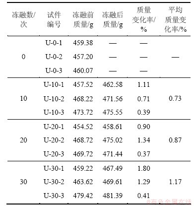 表3所示为经历不同冻融循环后的岩样剩余质量测定结果。从表3可见:各岩样的质量在冻融后均增大,其中U-30-1号样品的质量变化最大,增大值为1.8%;此外,每组岩样的平均质量变化率也随着冻融次数的增加而增大。其主要原因是岩样在每次冻结后,由于冰的冻胀和融缩作用,造成岩石内部微孔隙的不断增大以及在岩样内部产生了新的微孔隙,从而使得水分向岩石内部迁移,导致质量增大。