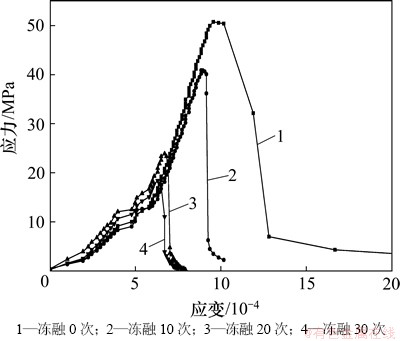 Fig. 1 Relationship between stress and strain of typical granite samples subjected to different cycles of freezing and thawing
