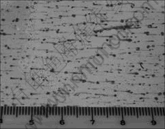 辊套表面不经处理裂纹微小肉眼直接观察不易发现。在辊套表面进行着色法处理(又叫渗透法,生产厂采用该方法检查辊套表面是否存在裂纹)后,可以观察到铸轧辊表面存在大量细小红色线段 —— 裂纹(见图1),裂纹方向为铸轧辊周向,与机械加工的切削痕迹方向基本相同。其中有的线段在一端有一个较大的红点——表明该处裂纹较大且较深,说明此处为裂纹源;而有的线段在两端各有一个较大的红点,表明两个裂纹源产生的裂纹在扩展过程中相遇并重合,这表明辊套表面裂纹具有较一致的方向性(铸轧辊周向)。这些方向及分布均较有规律性的裂纹遍及整个辊套表面,不可能是材料中的杂质等随机因素引起的。