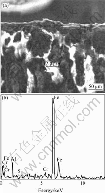Fig.4 EDS of fracture surface of roller: (a) Enlarged view; (b) EDS of fracture surface