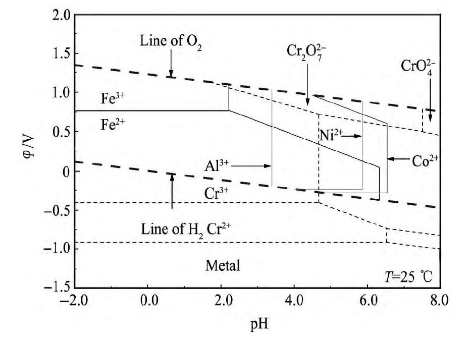 从负电位金属镍钴铝铬铁的水系φ-p H平衡图(图2)中可以看出,Ni2+,Co2+,Al3+,Cr3+,Fe3+和Fe2+在水溶液中偏酸性的区域内有较大的稳定存在区。在酸性范围内,Cr2+的稳定区域在H2线以下,表明Cr2+不能稳定存在于酸性水溶液中。这几种金属的稳定存在区域均在H2线以下,其放电电位均较氢负,所以在酸性条件下,相应的金属离子不会放电而析出,只有当其浓度积累到一定程度时,才可能在阴极得电子析出。总之,酸性条件下发生电极反应时,镍钴铝铬等均只以相应简单金属离子的形式进入溶液中,而相应的金属离子不会在阴极析出。