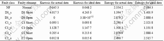 The experimental data of circuit without tolerance are listed in Table 1. It is shown that the values of the actual feature parameters are a little less than those of the simulation feature parameters, which is caused by the instrument readings having finite precisions and the values of elements changing in the real circuit. But we could still complete the fault dictionary correctly according to the actual acquisition data. Different fault classes fall into different groups based on the kurtosis and entropy of the extracted data, which means that these faults can be uniquely identified.