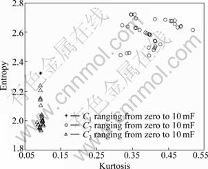 Figure 4 shows the soft fault classes of the nonlinear circuit when variable capacitors C1, C2 and C3 changed from 0 to 10 mF. The results are obtained by extracting the data 40 times through Monte-Carlo simulations for each capacitor being soft faulty by changing the values of the capacitors of the circuit. From Fig. 4, it can be seen that the soft faults of C1, C2 and C3 fall into different groups, which indicates that the method can be used to identify faults in nonlinear circuits as well.
