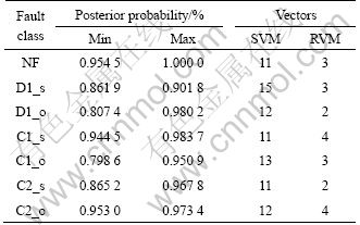The detailed performance of this system in diagnosing the eleven fault classes associated with the nonlinear rectifier circuit indicates that all of the 40 test data for each class are classified correctly. Thus, it can be concluded that the proposed method can diagnose hard and soft faults. And all the fault classes can be classified correctely for at least 99% of the test data for our example circuit. Table 2 summarizes the classification performance of RVM compared with that of SVM on the same data sets. It can be seen that classification accuracy of RVM is comparable to that of SVM, but the number of relevant variable is much fewer than that of support vector. At the same time, the posterior probability of likelihood function can judge classification accuracy, and also may reject some mis-classification situation. This is RVM practical superiority in classification of fault diagnosis.