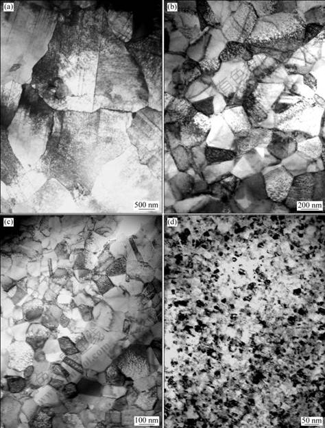 Fig.1 TEM images of Ni deposits obtained in electrolyte with different saccharin concentrations: (a) 0 g/L; (b) 0.55 g/L; (c) 0.65 g/L; (d) 1.00 g/L