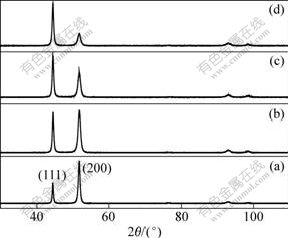 Fig.2 XRD patterns of Ni deposits with different grain sizes: (a) Coarse-grain, 2 mm; (b) Nanocrystalline, 258 nm; (c) Nanocrystalline, 93 nm; (d) Nanocrystalline, 16 nm