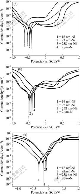 Fig.3 Potentiodynamic polarization curves of Ni deposits in 10% NaOH (a), 3% NaCl (b) and 1% H2SO4 solution (c)