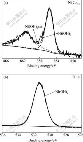Fig.4 XPS spectra of Ni 2p3/2 (a) and O 1s (b) acquired from 16 nm-Ni after being polarized in 10% NaOH solution at 40 mV for 5 min