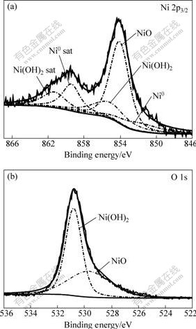 Fig.5 XPS spectra of Ni 2p3/2 (a) and O 1s (b) acquired from 16 nm-Ni after being polarized in 3% NaCl solution at 5 mV for 5 min