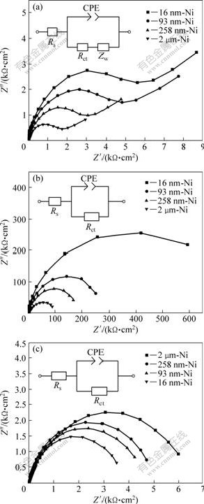 Fig.6 Nyquist impedance plots of Ni deposits in 10% NaOH (a), 3% NaCl (b) and 1% H2SO4 (c) solution after immersion for 30 min at their respective open circuit potentials(insets showing equivalent-circuit models for corrosion behavior of Ni deposits in above three kinds of corrosion media)