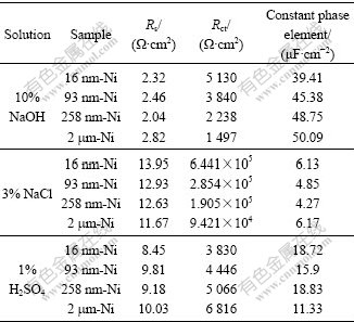 Table 2 Equivalent circuit parameters determined by modeling impedance spectra of Ni deposits with different grain sizes in 10% NaOH, 3% NaCl and 1% H2SO4 solution