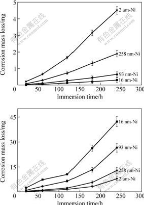 Fig.7 Mass loss curves of Ni deposits induced by immersion corrosion in 3% NaCl solution (a) and 1% H2SO4 solution (b)
