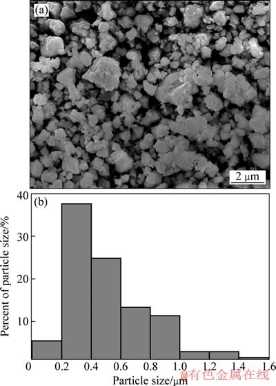 Fig. 1 SEM image (a) and particle size distribution (b) of PZT5-1 powder particles