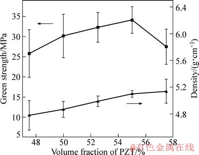 Fig. 4 Average strength and density of green body with different volume fractions of PZT solid loading