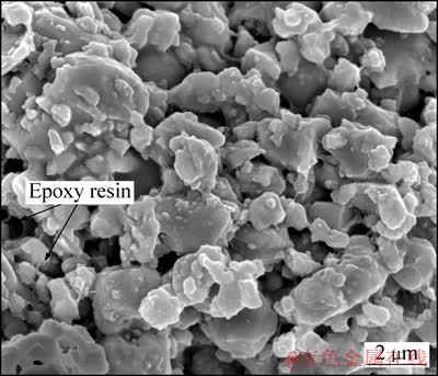 图4所示为海因环氧树脂含量为15%、不同固相含量PZT浆料经定量的DPTA固化后,陶瓷生坯平均强度和平均密度随固相含量的变化。当固相含量从47.5%增加至55%时,生坯的平均强度从(25.8±5.91) MPa增加至(34.1±3.31) MPa,但当固相含量从55%增加至57.5%时,生坯的平均强度反而急剧下降。当固相含量为57.5%时,其生坯平均强度达到(27.5±4.36) MPa。当固相含量从45%增加至57.5% 时,其平均密度从(4.78±0.22) g/cm3缓慢增加至(5.14±0.18) g/cm3。当固相含量较低时,生坯中存在大量的孔洞,获得的陶瓷生坯相对密度较低,因而强度较低;随着固相含量的提高,生坯中孔洞的数量减少,其相对密度随之提高,从而生坯的强度随之提高。但当固相含量增加至55%时,由于初始获得的陶瓷浆料存在大量的缺陷如颗粒团聚,这些缺陷被直接保留到陶瓷生坯中,导致其生坯强度呈现出下降的趋势。图5所示为海因树脂含量为15%、固相含量为52.5%的PZT浆料经定量的DPTA固化后,陶瓷生坯断面的SEM像。从图5中可以看出,生坯内部组织均匀,无较大颗粒团聚现象,陶瓷颗粒被环氧树脂聚合形成的三维网络胶结在一起,这与XIE等[24]和MA等[25]所研究的Al2O3凝胶注模体系中有着近似的生坯断面形貌。