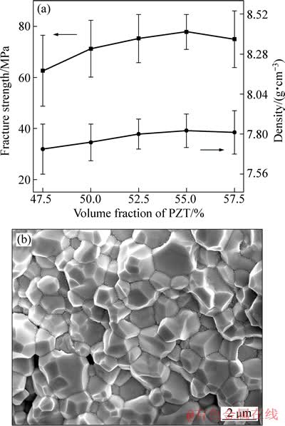 Fig. 6 Average fracture strength and density of sintered bodies with different volume fractions of PZT solid loading (a) and SEM image of fracture surface of sintering sample (b)