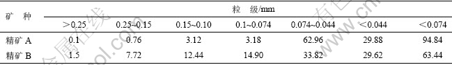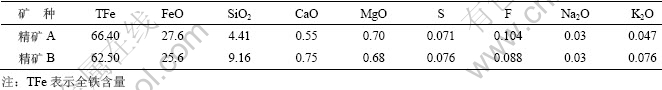 实验所用的含铁原料为来自某厂生产现场的2种铁精矿(用精矿A和精矿B表示),按现场生产实际配比(30%精矿A+70%精矿B,质量分数)配成混合料进行实验。铁精矿的化学组成和粒度组成见表1和表2。可见,2种精矿都是磁铁精矿,均含有少量的S,F,Na2O和K2O。精矿A的铁品位较高,SiO2较低,且粒度较小;而精矿B的铁品位较低,SiO2含量较高,且粒度较大。