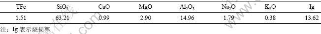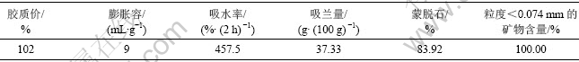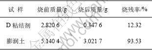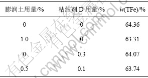 粘结剂有膨润土和有机粘结剂D。膨润土的化学组成和物理性能见表3和表4。有机粘结剂D是一种在具有多种支链结构的高分子化合物上植入了大量的羧基和羟基基团的合成物质。