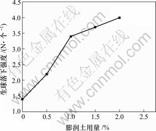 为了考查有机粘结剂D完全替代膨润土对造球的影响,对2种粘结剂分别进行了用量实验。造球时间为10 min,生球水分分别为各自的适宜水分(膨润土生球中水分为7.8%左右,粘结剂D生球中水分为8.5%左右),结果如图1和图2所示。