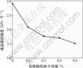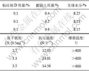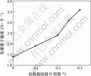 用有机粘结剂D造球时,生球落下强度在其用量为0.25%时即可达到3.1次/(0.5 m),用量为0.30%时则达到了3.6次/(0.5 m)。这一实验结果表明,粘结剂D用量为0.25%~0.30%即可达到膨润土用量为1.0%时的生球强度。