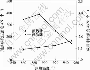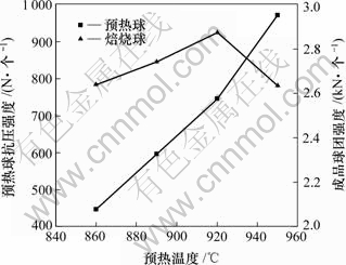 Fig.5 Effect of preheating temperature on strength of pellet of combined binders